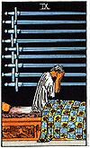 Unlike the pain of the Three of Swords which seems to come from without, the Nine of Swords represents the pain that we generate from within. What tortures we put ourselves through when our fears and doubts overwhelm us. Worry is probably the most common. Have I done enough? Will everything work out OK? What am I going to do? The thoughts go round and round - impossible to turn off.