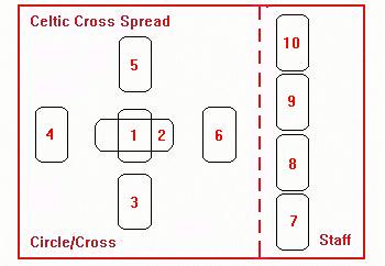 You can think of the Celtic Cross as divided into two sections: the Circle/Cross (six cards) on the left, and the Staff (four cards) on the right. (See diagram above.) The Circle/Cross simulates the Celtic cross found throughout Ireland. This cross has a circle linking the four perpendicular spokes. The circle and cross symbolize the joining of spirit and matter and the unity of all events in time.