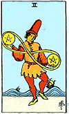 There is nothing quite like the feeling of being graceful and effective at the same time. On the Two of Pentacles we see a young man dancing as he juggles his worldly concerns. The infinity sign loops around the two pentacles to suggest that he can handle unlimited problems. In the background we see two ships riding the waves easily - cruising the ups and downs of life.