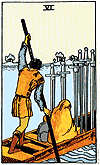 The Slough of Despond is a good name for the Six of Swords. Sometimes this card represents a dull, listless state. Nothing is seriously wrong, but nothing is really right either. You're getting by, but not thriving. In the picture the figures in the boat seem sad and disengaged. Life is indeed uninteresting when we feel the blues.