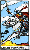 On the positive side, the Knight of Swords is a master of logic and reason. He has a keen intellect that grasps the fine points of any subject. He speaks clearly, directly and always with authority. His judgments are sure and free of emotion. Others rely on his lucid analyses of problems and solutions. On the negative side, this Knight is not a master of diplomacy. He can be downright tactless and rude. When he thinks you are wrong, you'll know it. He's convinced of his own superiority and has little tolerance for stupidity. He expects others to comply with his views. To him, feelings are irrelevant and illogical.